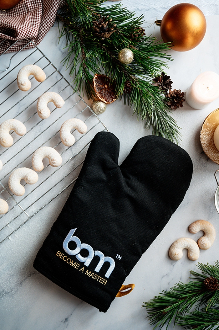 Díky svému modernímu designu a elegantní, ale neutrální černé barvě se rukavice na pečení BAM stala nejlepším přítelem cukráře. Ochrání vaše ruce před horkými plechy s čerstvými sušenkami. A díky svému protiskluzovému materiálu zabrání tomu, aby vám horké hrnce a plechy na pečení vyklouzly z rukou. Rukavice BAM Baking Glove není vhodná pro praní v pračce ani sušení v sušičce. Rozměry rukavice jsou 29 cm x 17 cm.