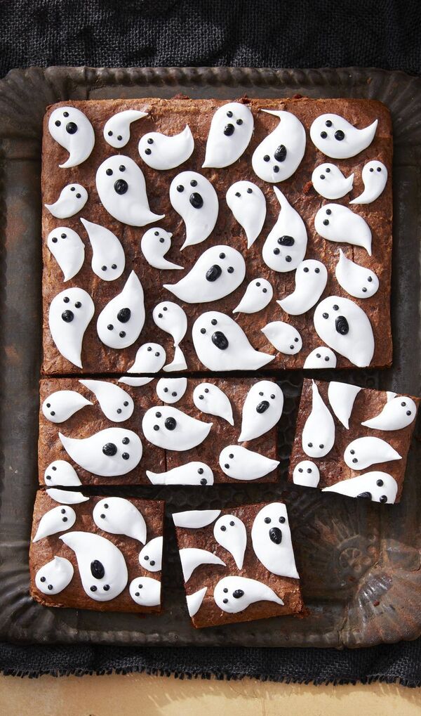 Do cukrové směsi přidejte scezenou a změklou želatinu. Šlehejte elektrickým mixérem při střední rychlosti asi 3 minuty. Zvyšte rychlost a mixujte, dokud se nevytvoří měkké špičky, což bude trvat někde mezi 8 a 10 minutami. Vzniklou marshmallow směs přelijte do zdobicího sáčku. Pomocí zdobicího sáčku nanášejte marshmallow přímo na brownies. Nechte je alespoň hodinu zaschnout a poté jim černou polevou nakreslete oči a ústa. Brownies jsou připraveny k podávání.*Obrázek: Tara Bench