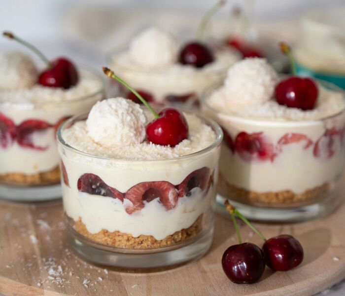 @bamchocolate.com Dance with sunny cheerfulness to the flavours of this heavenly coconut dessert with juicy cherries ?? Create a refreshing treat without baking and enjoy. ☀️ Who will you share these sweet moments with? ? INGREDIENTS: 100 g of ground biscuits 30 g melted butter 150 g mascarpone cheese 200 ml whipping cream 1 BAM coconut topping with wafers Cherries Coconut flour (as a topping) PREPARATION: 1. In a bowl, mix the ground biscuits with the melted butter to make a smooth mixture. 2. To make the coconut cream, in another bowl combine the mascarpone cheese, whipping cream and BAM coconut topping with wafers. Stir until you have a smooth cream. 3. Place a layer of the cookie mixture in the glasses, followed by a layer of the coconut cream and the cherries. Repeat this process until the jars are full, with the last layer being the coconut cream. 4. Sprinkle a little coconut flour on top of each jar and garnish with cherries or other garnishes if desired. 5. Place the dessert in the fridge to chill well and allow the ingredients to combine. Serve chilled and enjoy. ? #coconut #dessert #desserttiktok #summerdessert #recipesoftiktok #recipes #bam #becomeamaster ♬ original sound - BAM (Become A Master)