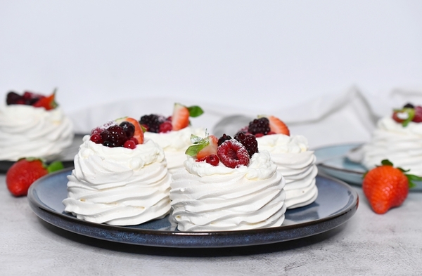 Tento dort potěší i ty nejnáročnější gurmány. Skládá se z křehké bílkové krusty, měkkého středu, šlehačky a spousty čerstvých bobulí. Vyžaduje trochu péče a více času na přípravu, protože má-li zůstat sněhobílý, musí být teplota pečení nižší. Dělala jsem porcované dorty, protože je mám raději, ale můžete použít suroviny na jeden větší dort. Suroviny uvedené v receptu vystačí na 6 malých dortů nebo jeden velký dort o průměru 20 cm.