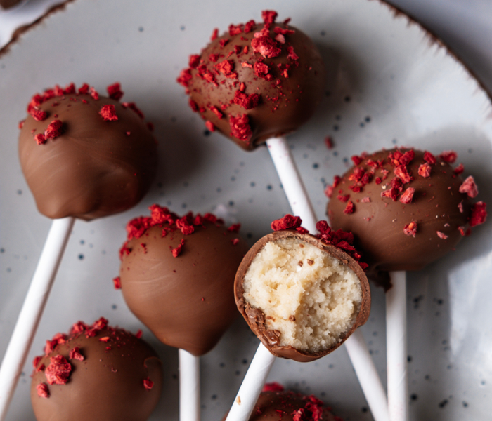 Kuličky potřete rozpuštěnou čokoládou a posypte lyofilizovanými malinami.